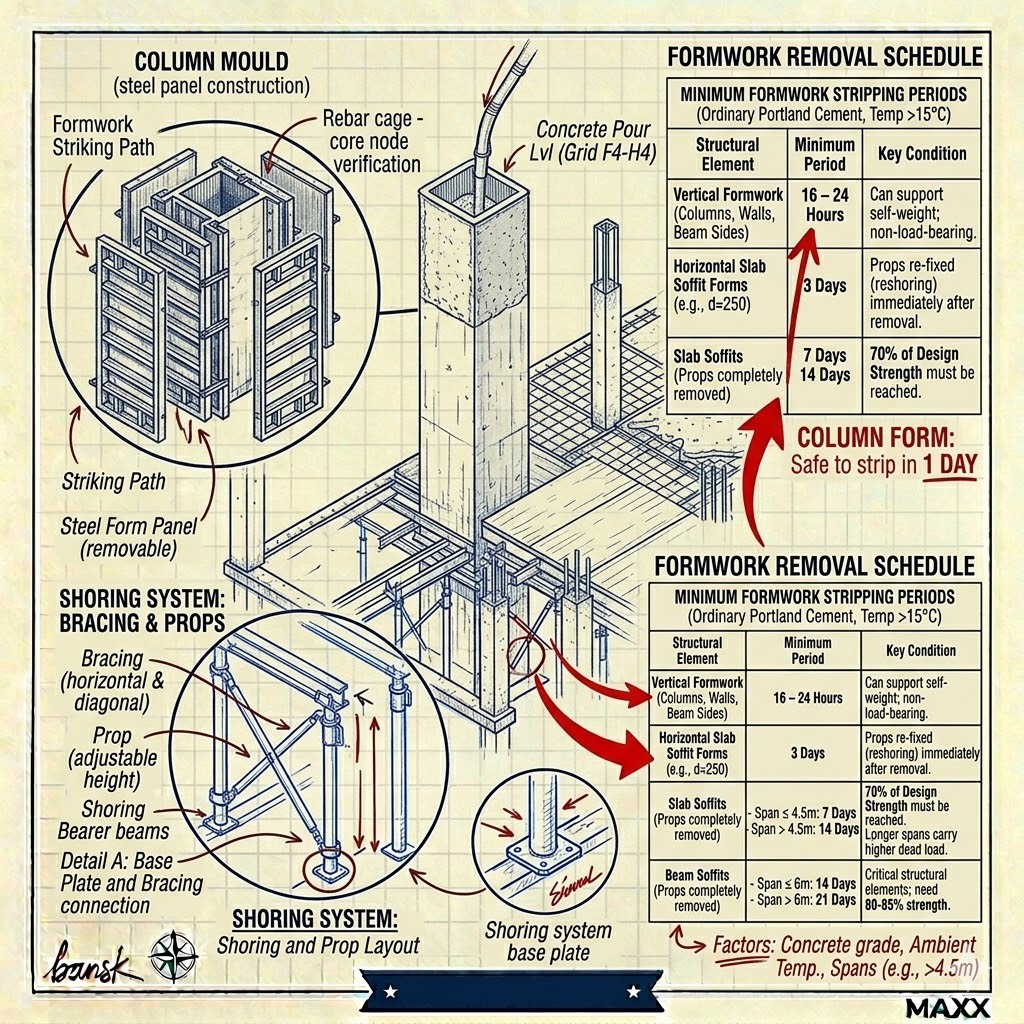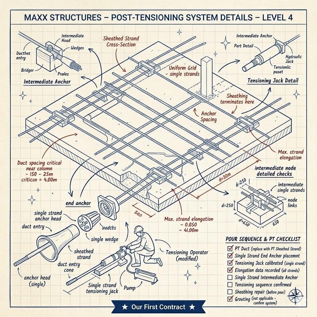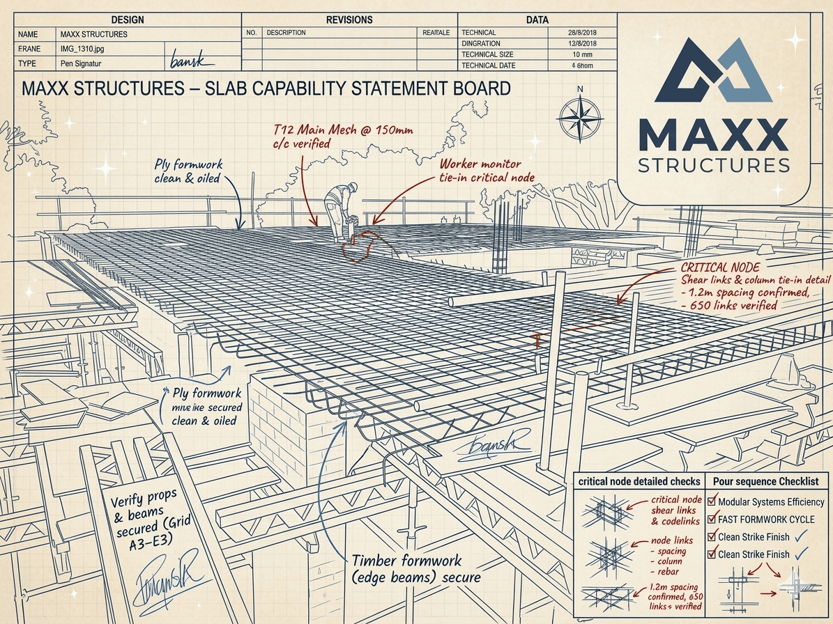 In the context of the Maxx Standard, Post-Tensioning represents the pinnacle of the "Three Trades in Unison." The formwork must be precise to house the tendons, the steel (tendons and burst reinforcement) must be placed with surgical accuracy, and the concrete pour must be flawless to ensure the chemical hydration provides the necessary strength for the tensioning phase.
