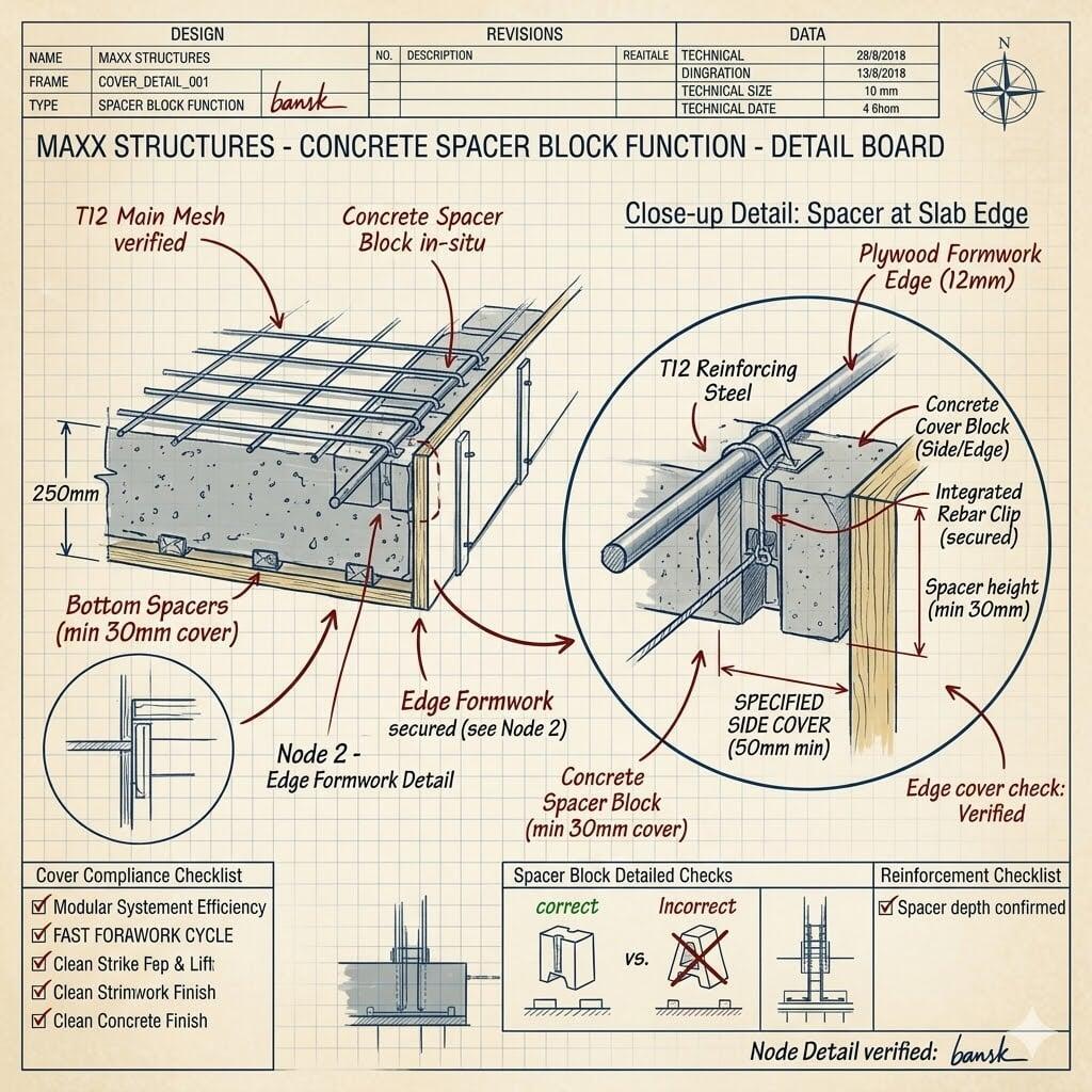 At Maxx Structures, we don't allow steel to simply rest on the formwork. We utilize the correct spacer for the specific environment—especially in the Western Cape, where the coastal air is high in chlorides.