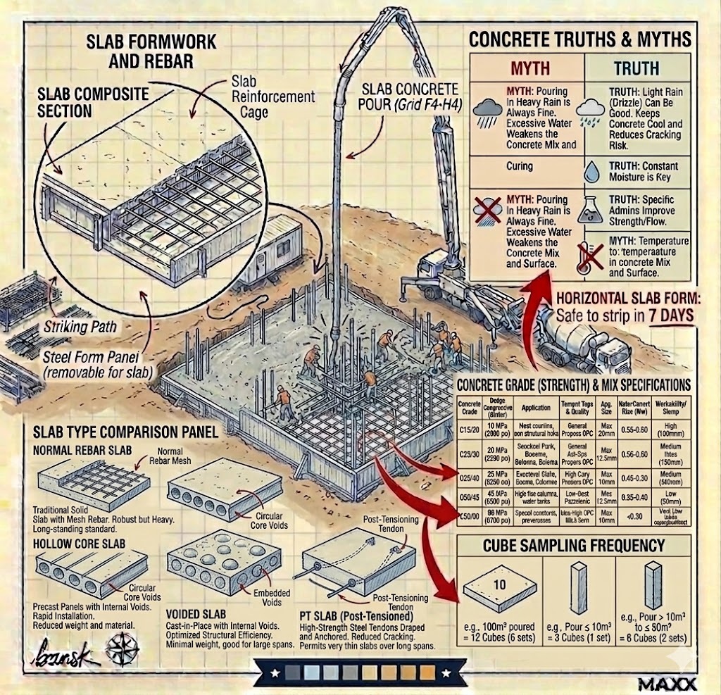 In the context of the Maxx Standard, concrete is the final, permanent realization of the structural design. While formwork and steel provide the shape and the skeleton, the concrete pour is the "moment of truth."