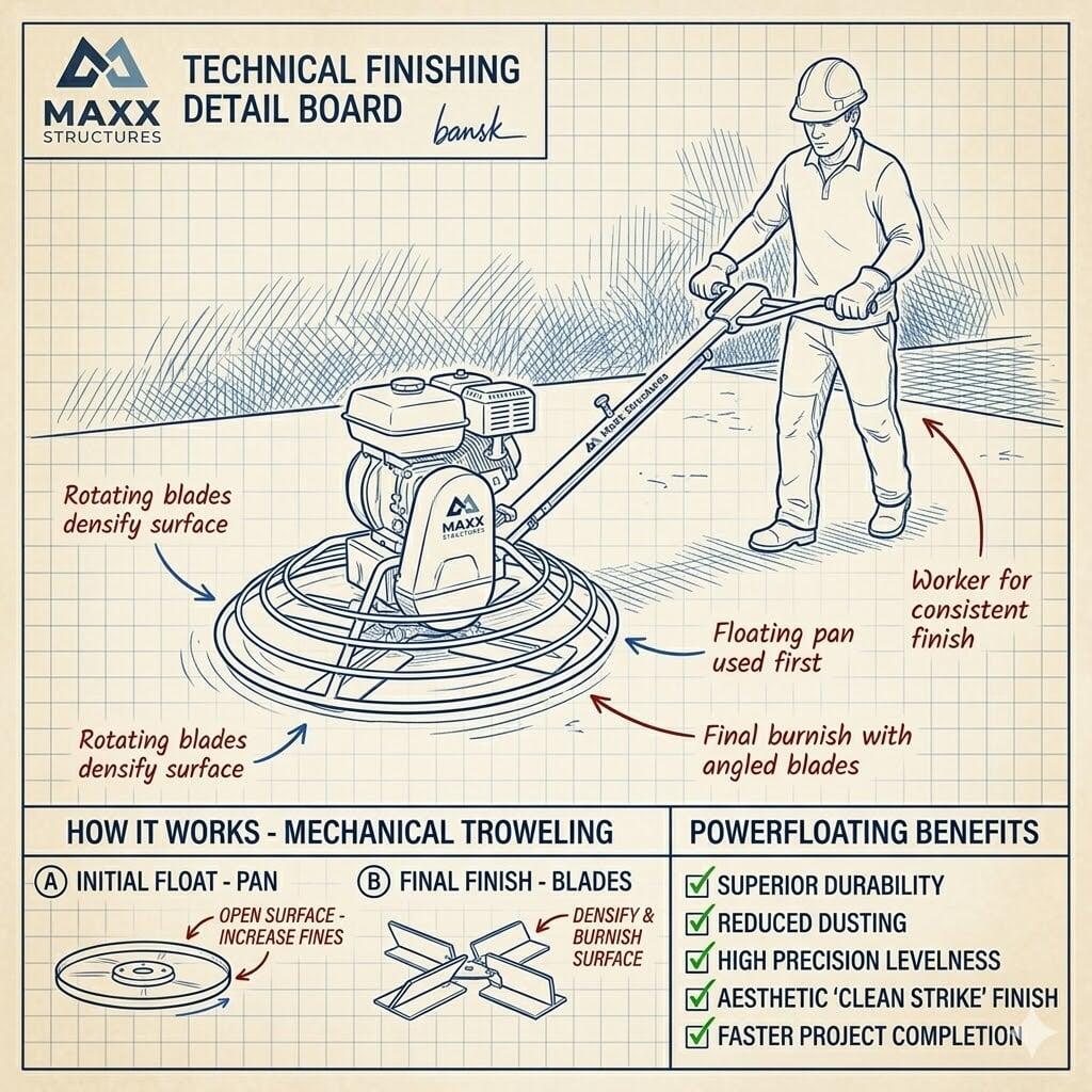 Powerfloating (also known as "trowelling") is the mechanical process used to achieve a smooth, dense, and highly level finish on green concrete slabs. It is the final stage of the concrete trade, occurring after the pour but before the concrete has fully hardened.