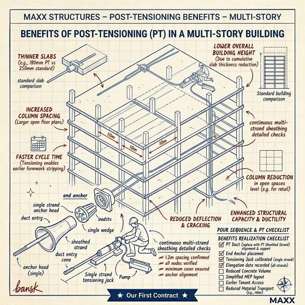 Longer Spans: Because the slab is more efficient, you can have larger distances between support columns. This is why PT is the standard for open-plan offices and parking garages.
